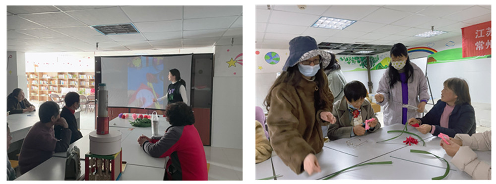 本次课程是一次社区课程,上课时间正好是3月8号,授课对象都是社区“女神”,为了应景,龙城小学美术老师郑悦特别安排了纸艺玫瑰花制作活动。